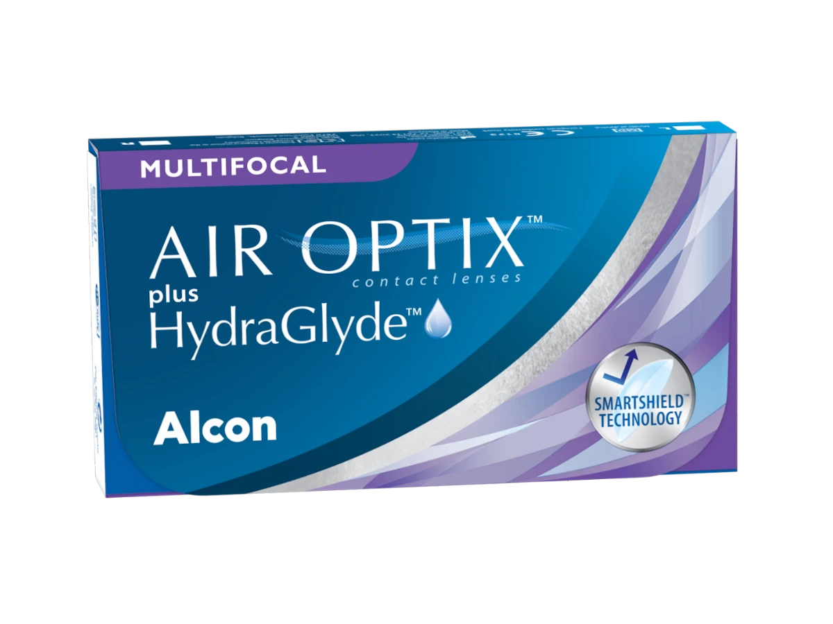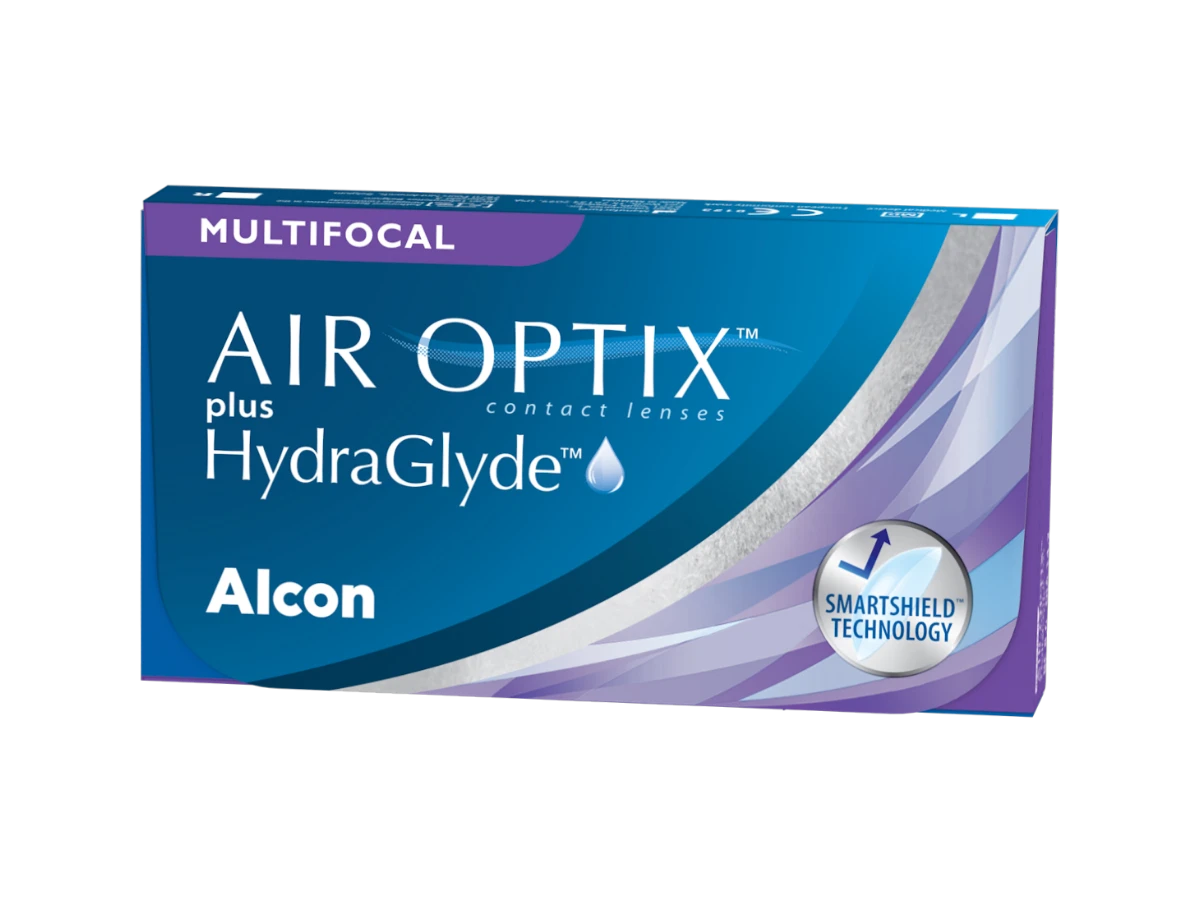 Air Optix Plus HydraGlyde Multifocal are monthly reusable multifocal contact lenses from Alcon, designed to provide clear vision at near, intermediate, and far distances. They combine advanced optical design with moisture and surface protection technologies to support comfortable, stable vision throughout the month.